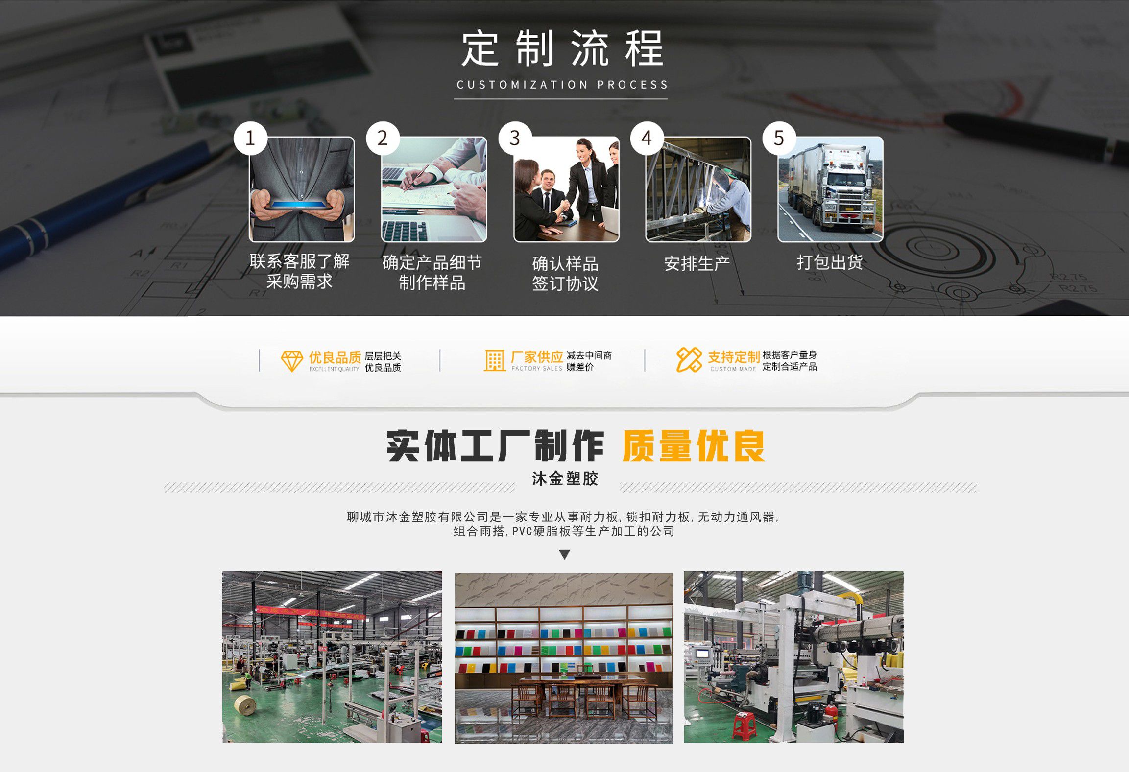 聊城市沐金塑膠有限公司注冊資金2180萬元,占地20000余平方,擁有自建廠房15000平方,員工100余名。10余年來,公司主營耐力板,鎖扣耐力板,耐力板深加工,無動力通風器,組合雨搭,PVC硬脂板,耐力板廠家等板材的發展戰略,逐漸成長為綜合性企業?! 」緭碛卸鄺l板材共擠生產線,采用世界知名品牌進口原材料和先進工藝,依據完善的ISO9001質量管理體系和ISO14001環境管理體系,為產品的卓越品質提供了強有力的保證。憑借過硬的創新能力和堅實的硬件基礎,贏創已成為國內領先的熱塑性板材生產商,產品被廣泛應用于建筑業、農業、工業、廣告業、安防行業及DIY領域。  公司始終致力于通過提供最優的板材應用解決方案,為客戶創造最高的價值;堅守創新、質量、靈活、服務和速度的核心價值觀;堅持“完美的產品需要完美服務的支持”的經營理念,努力實現成為世界領先的板材與解決方案供應商的夢想?! ≡谖磥?,公司將立足客戶需求,不斷改變和完善現有產品,拓展產品線和充分開發板材的應用領域,為客戶創造全方位的價值。同時更好地實現員工的價值,實現公司團隊的價值。我們將與您一起創贏未來!  企業使命:成為世界領先的板材與解決方案供應商?! 」驹妇埃和ㄟ^提供最優的板材應用解決方案,為客戶創造最高的價值?! 『诵膬r值觀:質量...